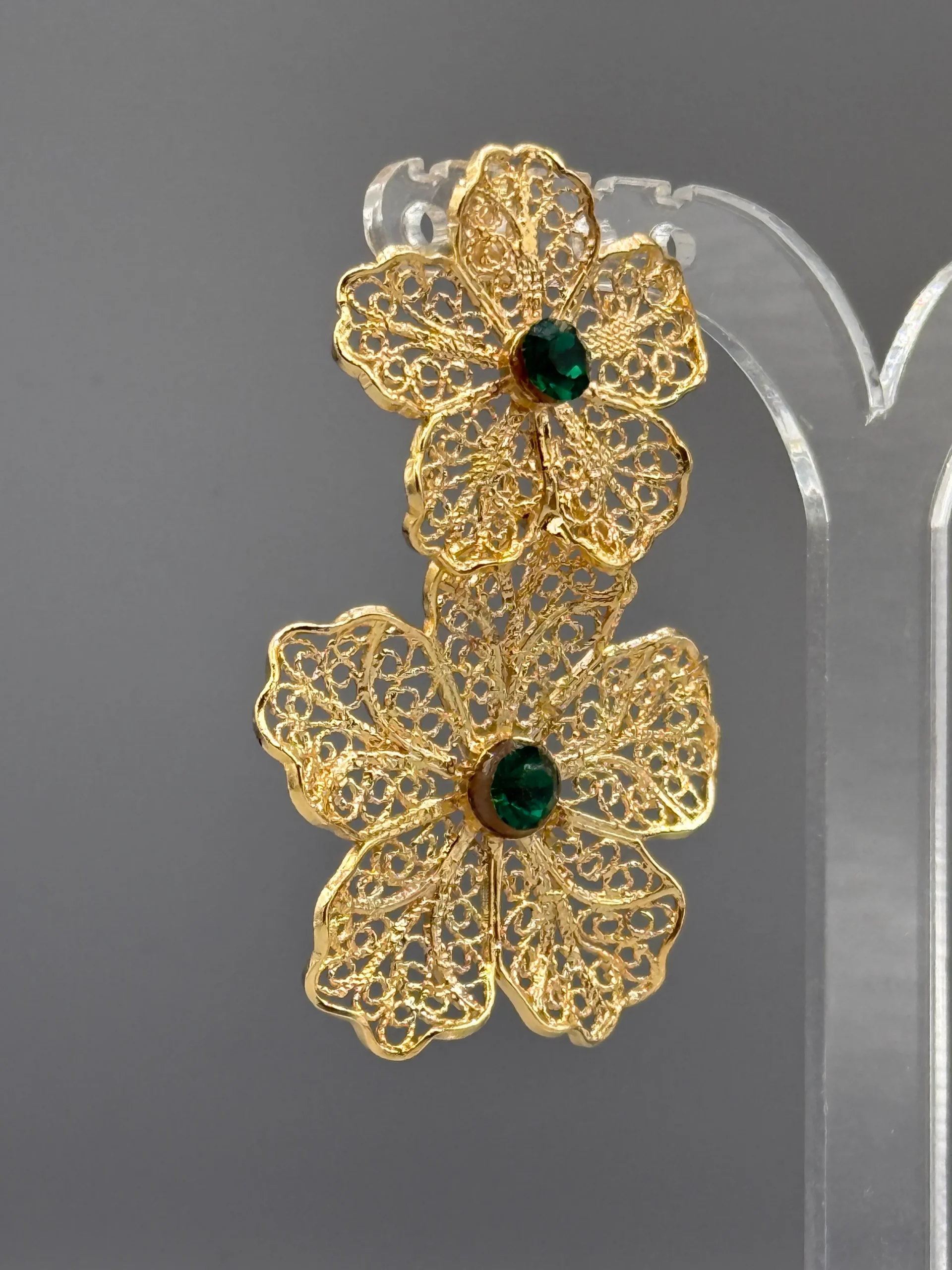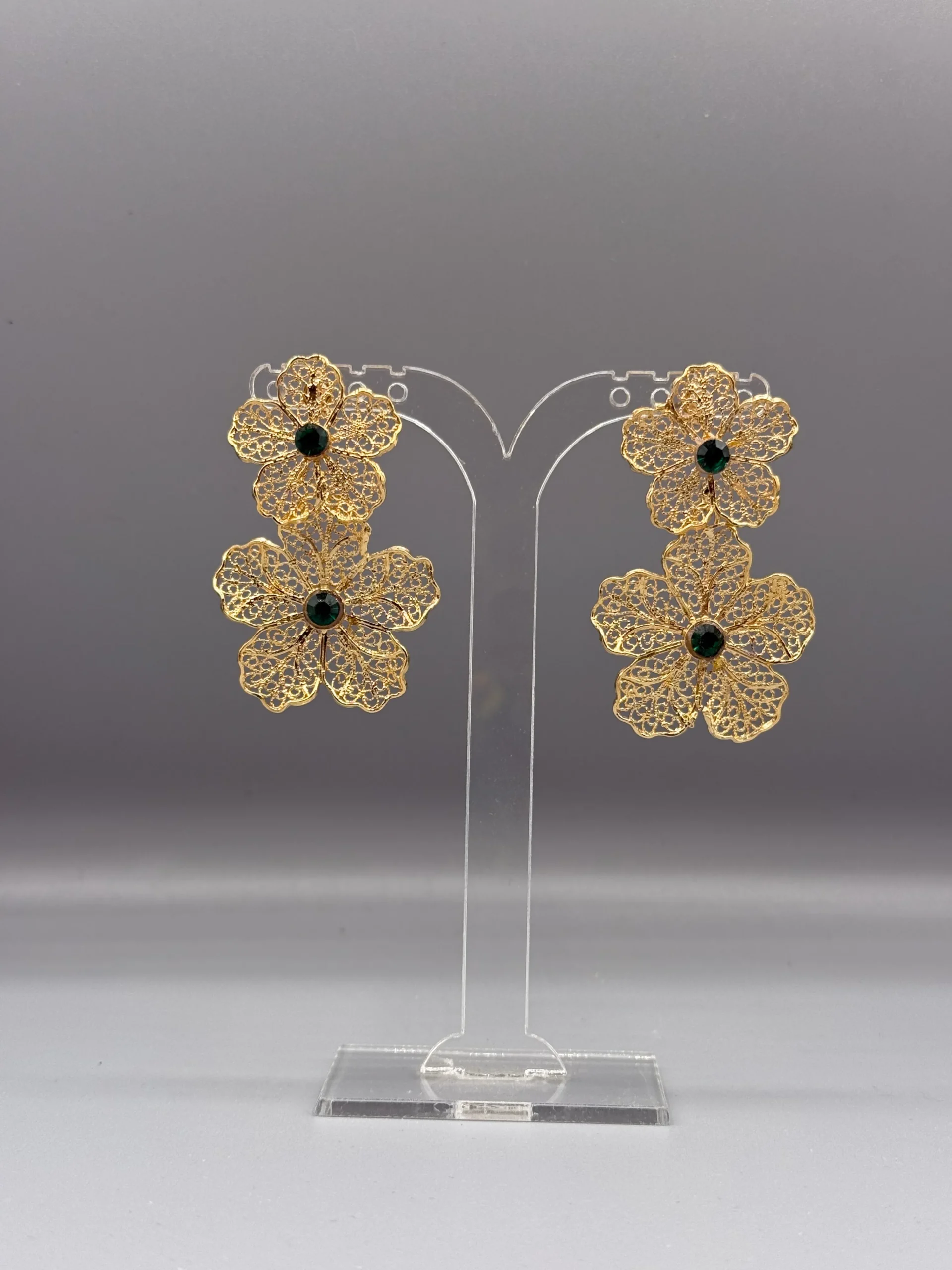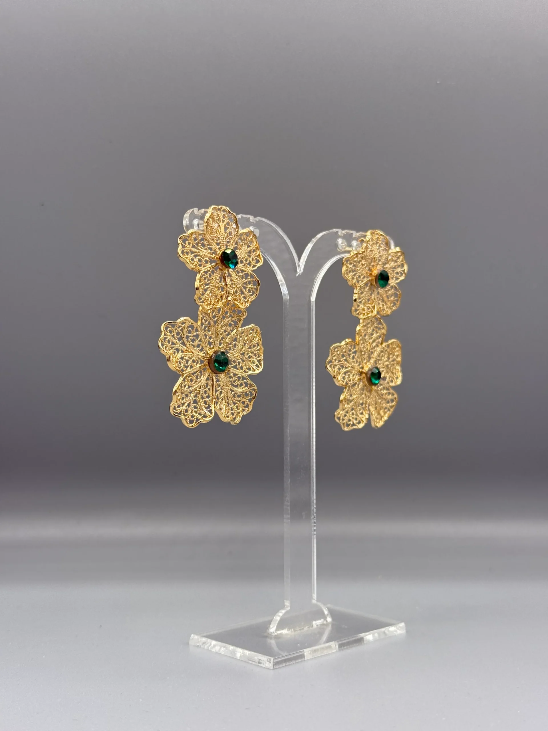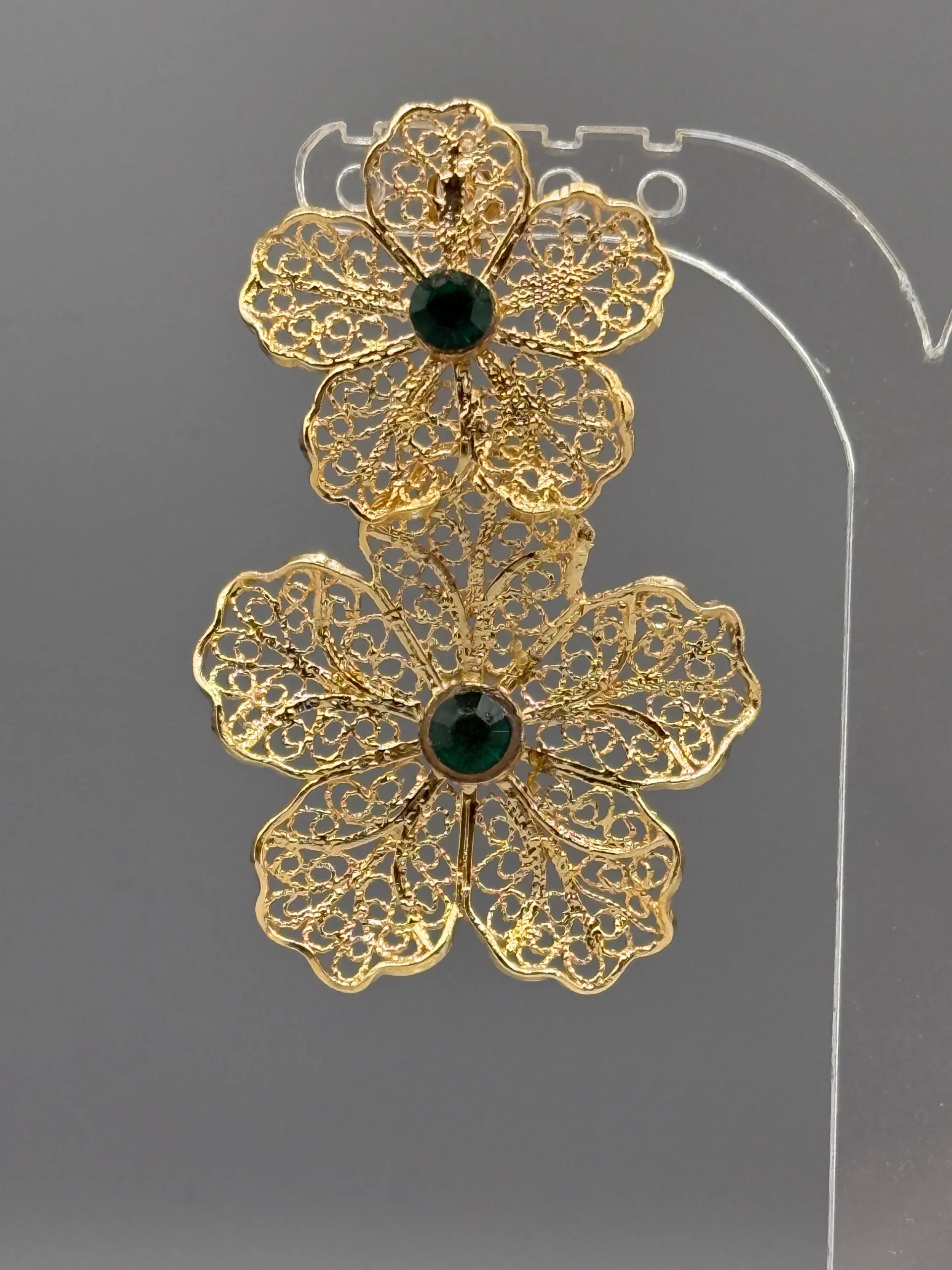 Pendientes dorados de filigrana DOBLE FLOR VERDE
