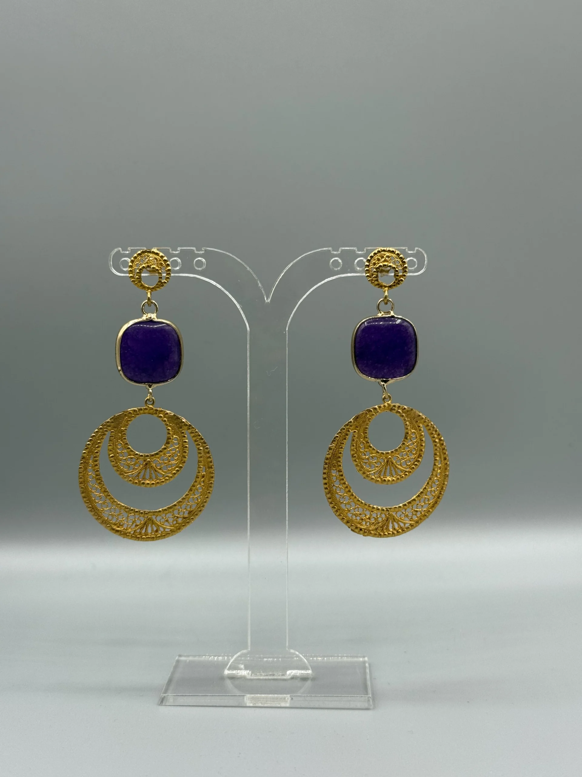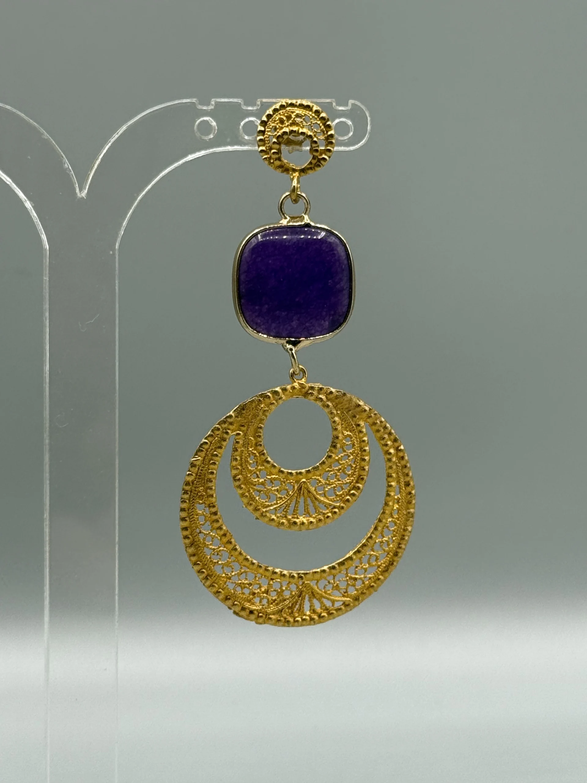 Agrega sofisticación a tu look con estos pendientes dorados de filigrana de metal bañados en oro y piedra natural. Estos pendientes son la elección perfecta para una apariencia elegante y con estilo.