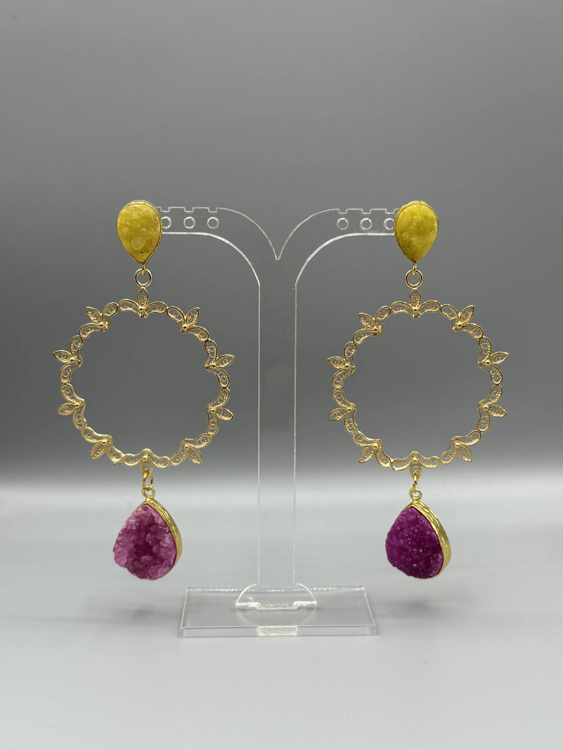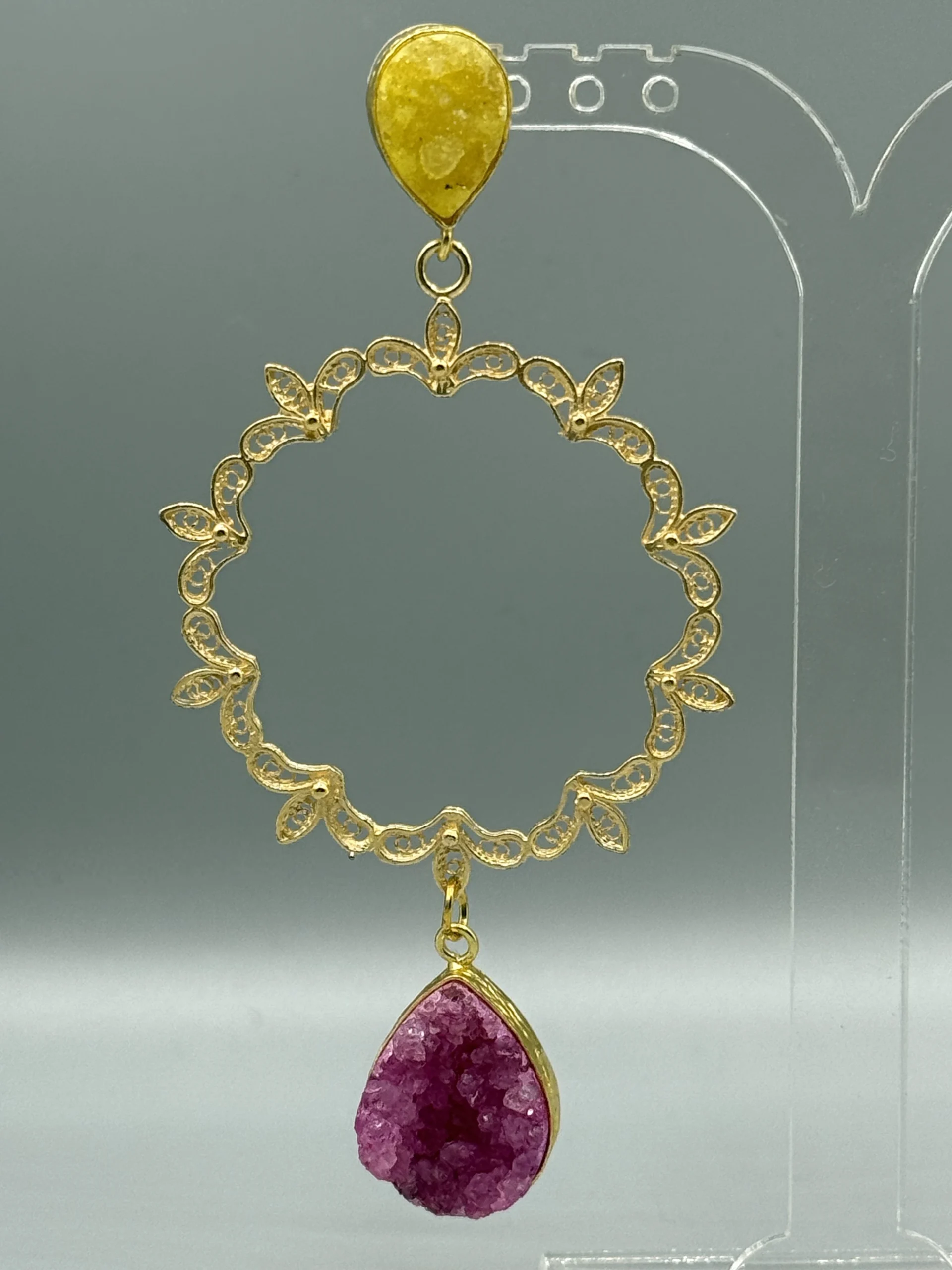 Agrega sofisticación a tu look con estos pendientes dorados de filigrana de metal bañados en oro y piedra natural. Estos pendientes son la elección perfecta para una apariencia elegante y con estilo.